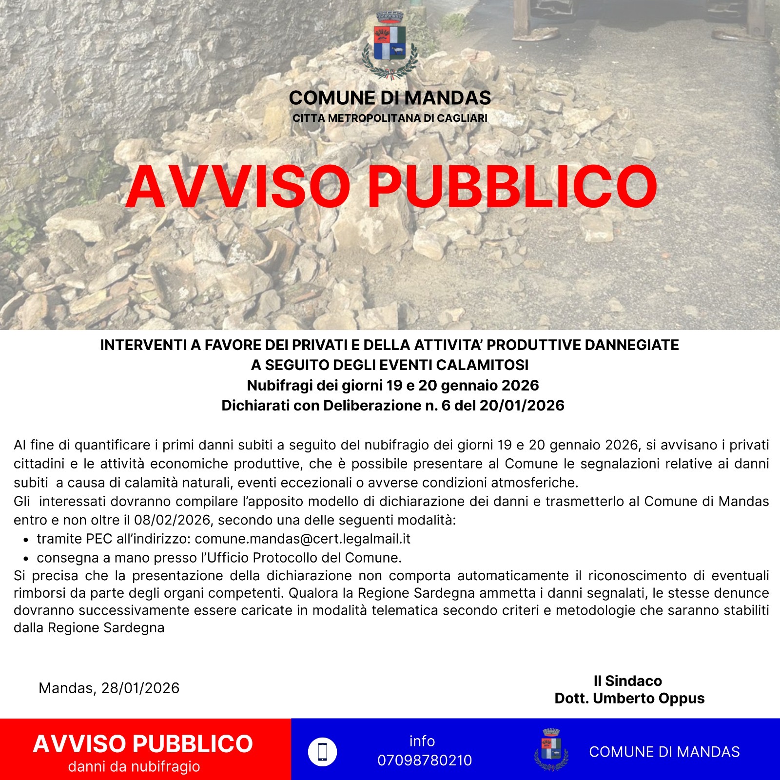 Avviso pubblico. Interventi in favore dei privati e delle attività produttive dannegiate a seguito degli eventi calamitosi